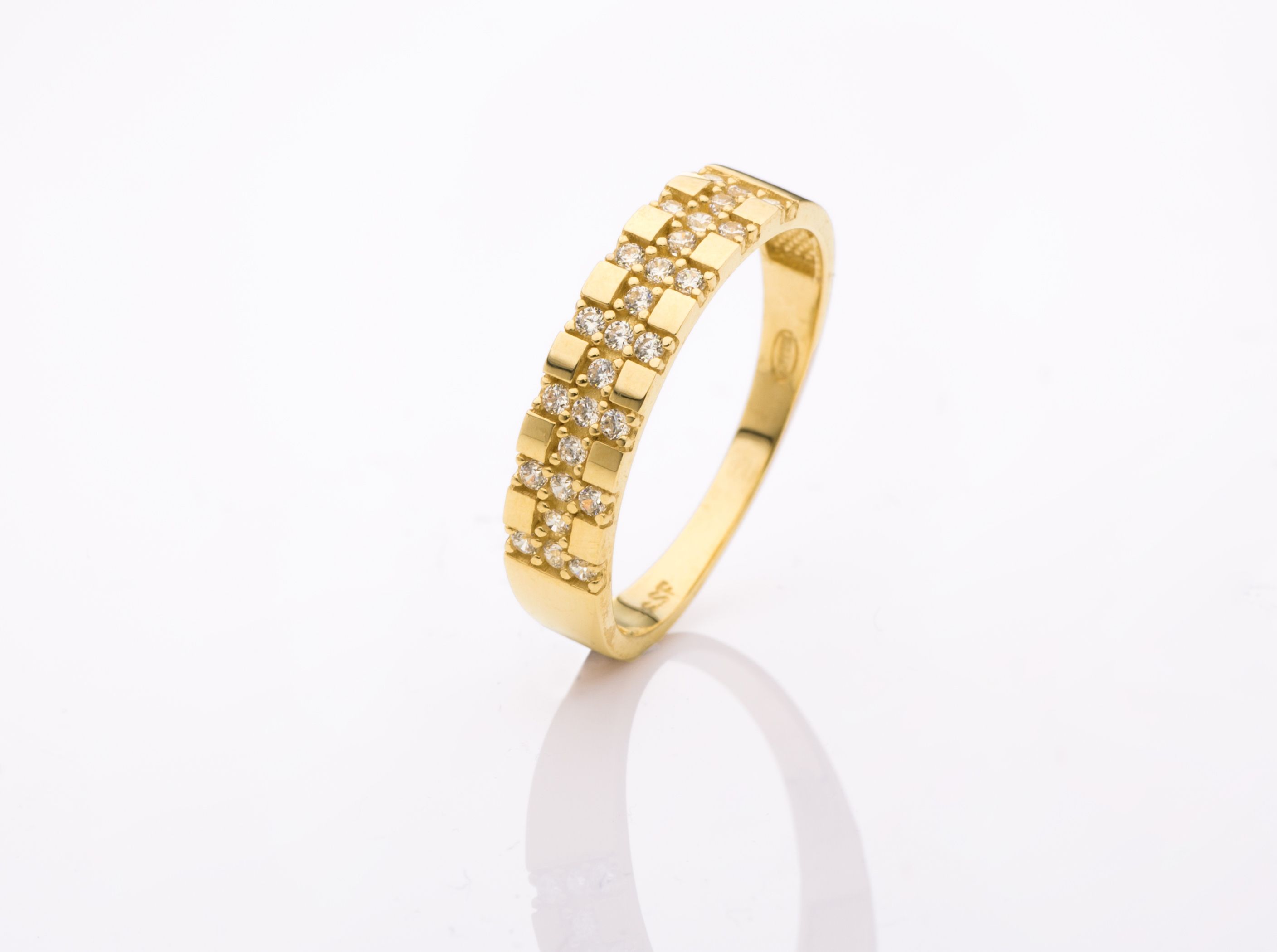 Anillo de oro en su color de 18 Kt con 7 bandas verticales y 1 horizontal de circonitas.