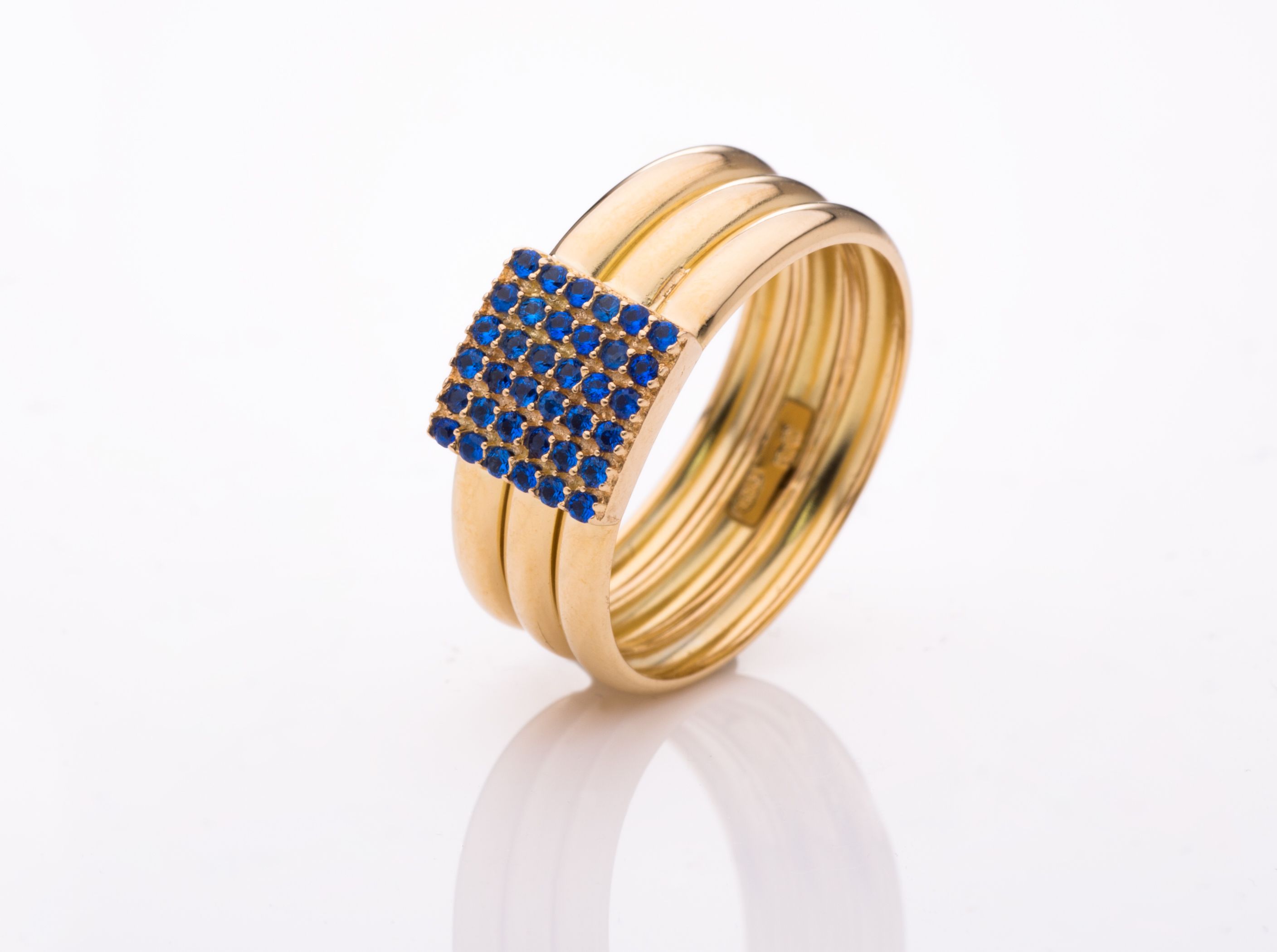 Anillo en oro en su color de 18 Kt con 3 brazos y centro cuadrado con topacios azules.