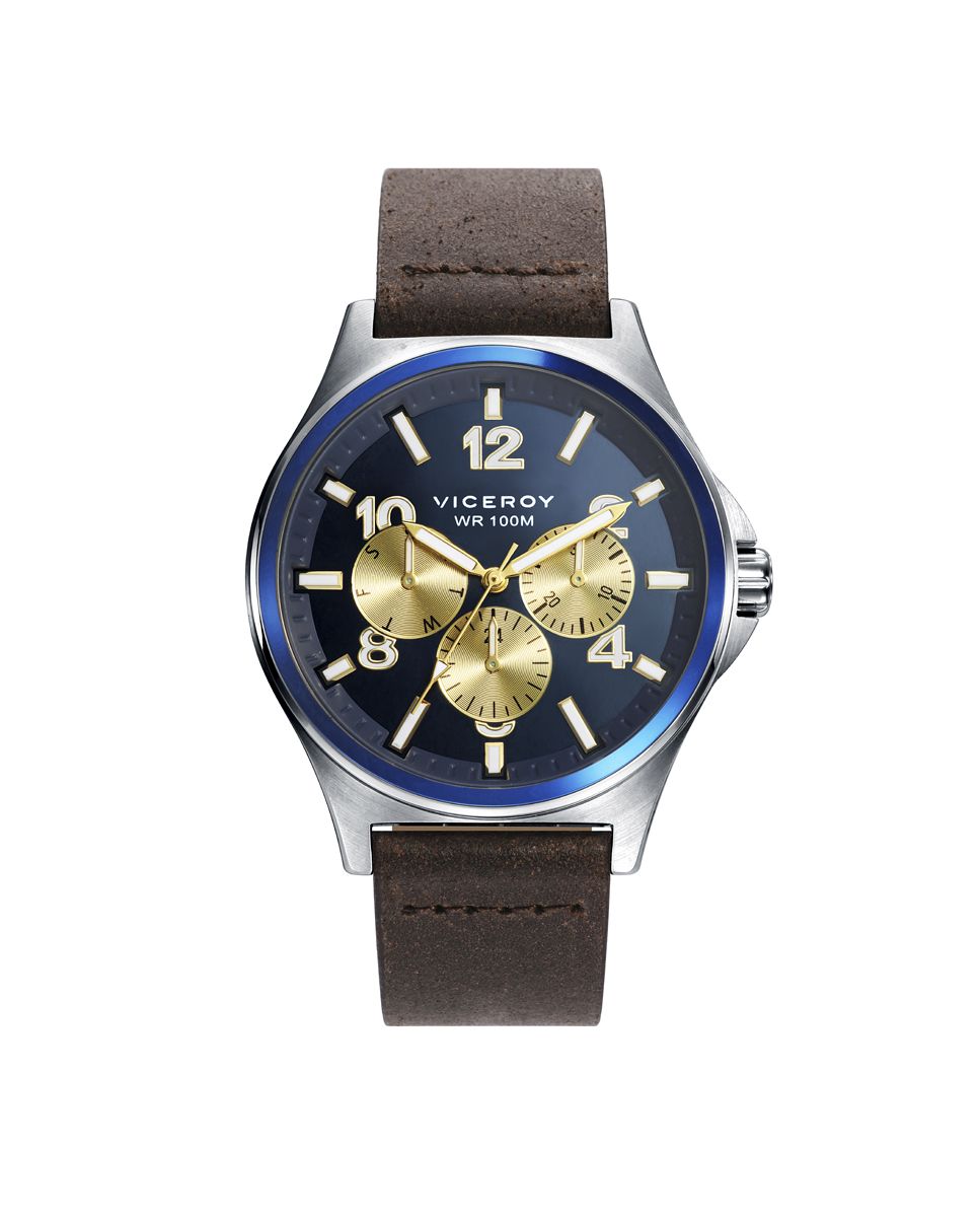 Reloj de Hombre Viceroy Beat multifunción con caja de acero y bisel azul. Esfera azul, contadores dorados, índices en blanca y correa de piel marrón chocolate efecto desgastado