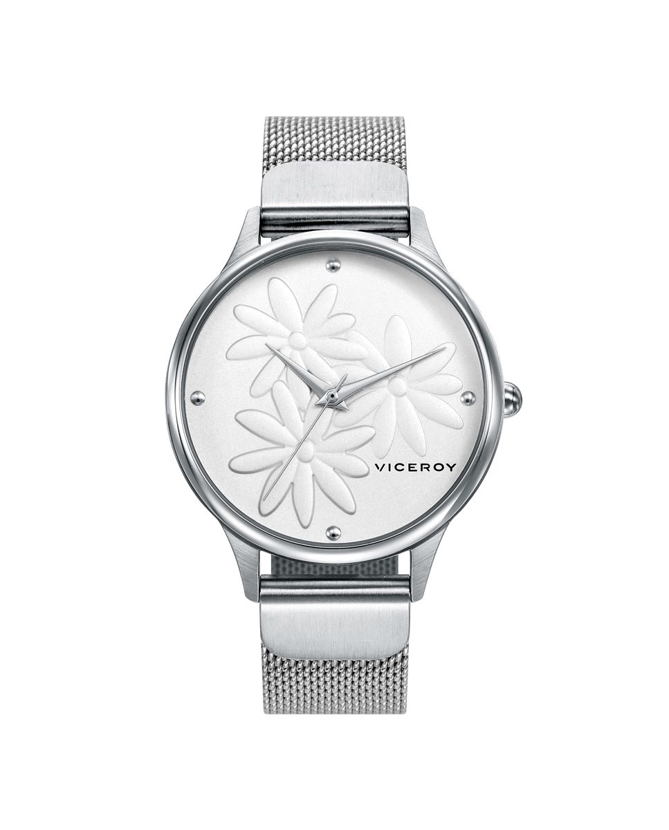 Reloj de Mujer Viceroy Kiss tres agujas con la caja de acero, esfera blanca con flores en relieve, índices plateados y malla milanesa