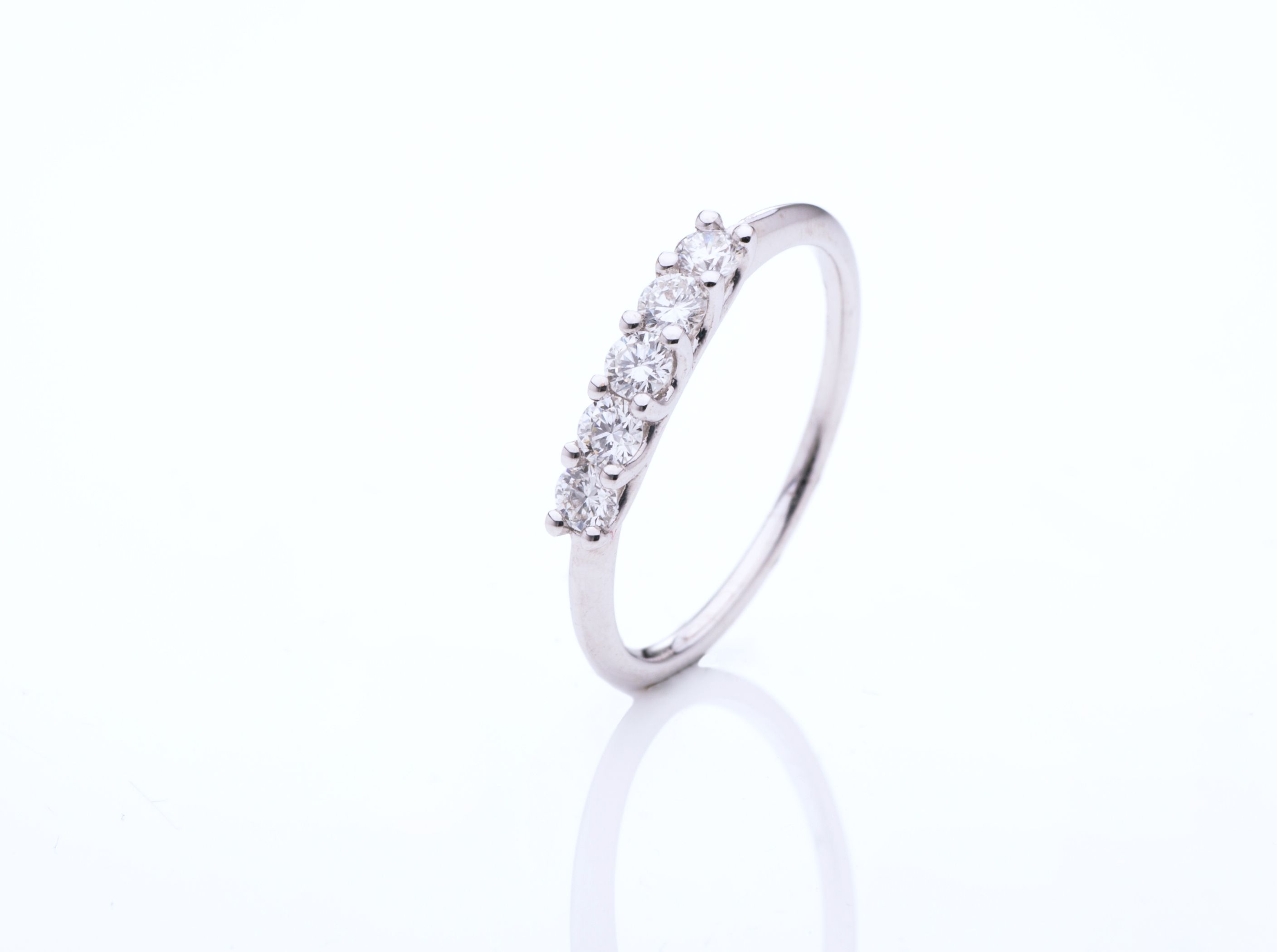 Alianza realizada en oro blanco de 18 Kt con 5 diamantes en talla brillante con un peso total de 0,40 ct engarzadas en garras. Características de los diamantes: Pureza VS, color G, talla buena.